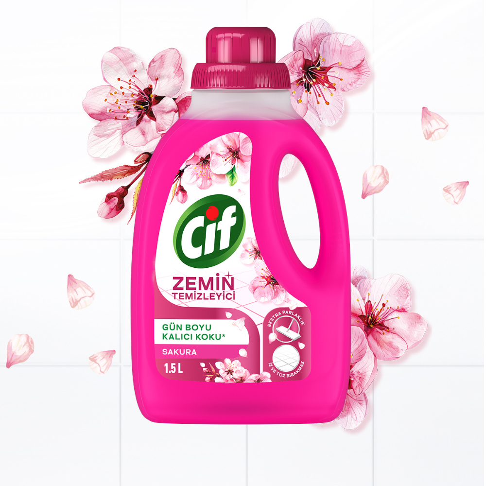 Cif Yüzey Temizleyici Sakura 1500 ml ile evinizde hem hijyenik temizlik hem de çiçeksi ferahlık bir arada.