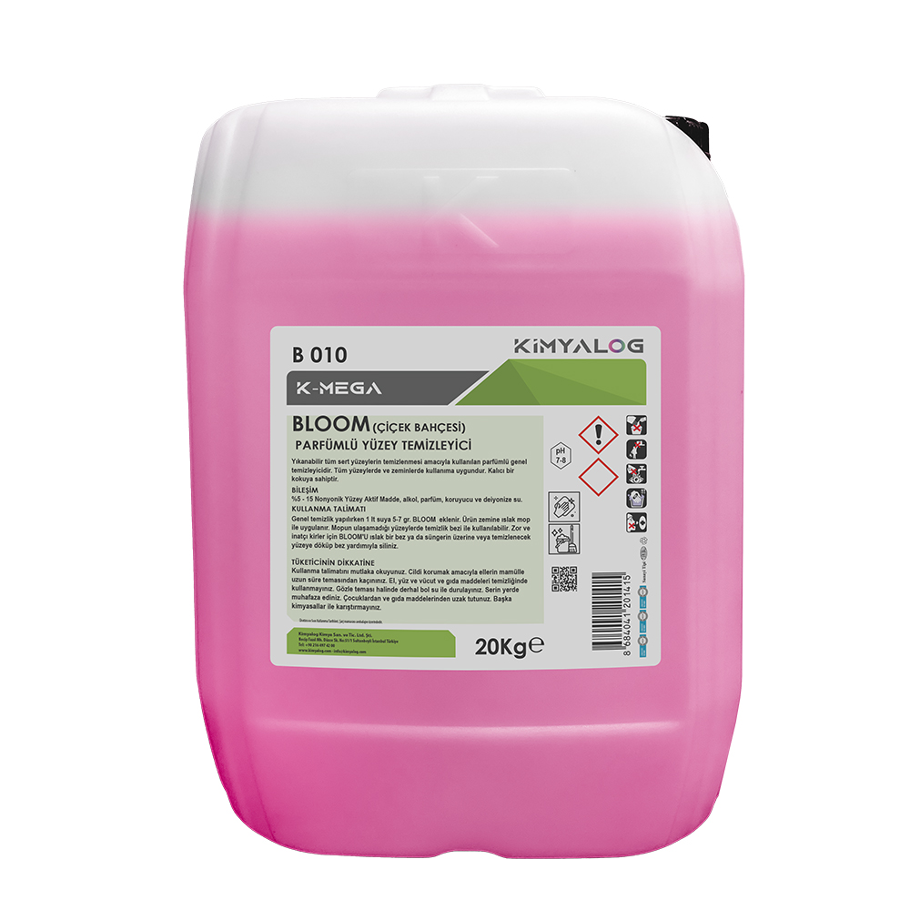 Kimyalog Parfümlü Yüzey Temizleyici Çiçek Bahçesi 20 Kg, yıkanabilir tüm sert yüzeylerin günlük ve yoğun temizliği için geliştirilmiş etkili bir genel temizlik ürünüdür. Güçlü formülü sayesinde kir, yağ ve lekeleri yüzeylere zarar vermeden kolayca temizlerken, Çiçek Bahçesi kokusunun ferah ve kalıcı etkisiyle ortama hoş bir koku yayar.